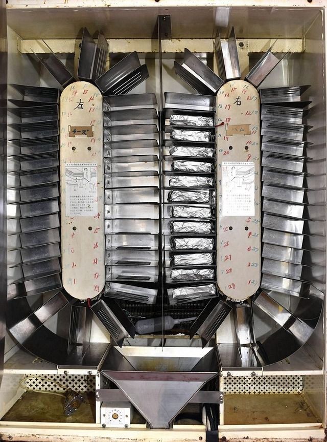 トーストサンド自動販売機の内部。下に落ちたサンドイッチを熱い鉄板に挟んで焼く