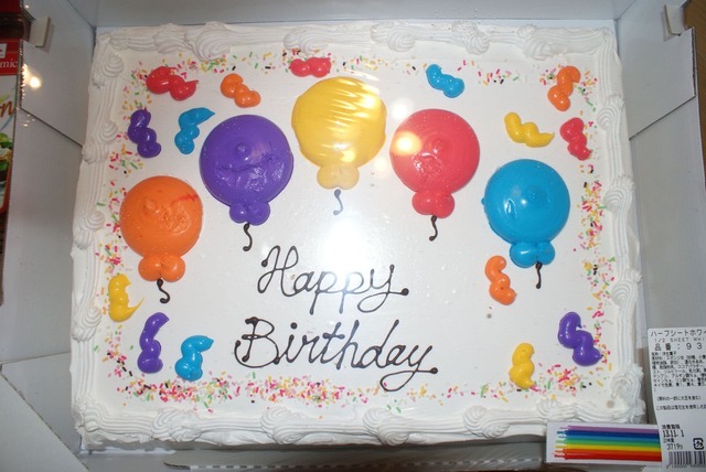 風船がデザインされている長方形のケーキ集まりで食べた