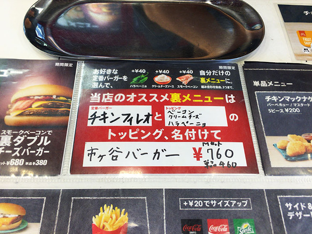sssp://img.2ch.sc/ico/anime_jyorujyu03.gif マクドナルドが新メニューとして発売を開始した裏メニューシリーズ。 ・ガチでウマイと大絶賛 客が好きなトッピングを追加して裏メニューを完成させる仕組みだが、それぞれの店舗で、マクドナルド店員が考案した裏メニューも販売しているのをご存知だろうか。数ある「店員考案の裏バーガー」のなかでも、ガチでウマイと言われているのがマクドナルド市ヶ谷店の「市ヶ谷バーガー」である。 ・すべてが極上かつ絶妙なバランス この市ヶ谷バーガー、ぶっちゃけ名称は地味だが(というかストレートすぎる名称だが)、その味、その食感、ポテトとコーラとの相性、すべてが極上かつ絶妙なバランスの絶品バーガーなのだという。世界中のマクドナルドを食べ歩いているハンバーガーマニアの工藤さんは以下のように語る。 続きはソース http://buzz-plus.com/article/2016/06/17/mcdonalds-uramenu/