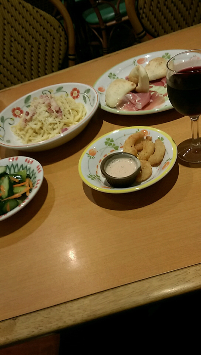 今ワインとプロシュートとボナーラ頼んだ