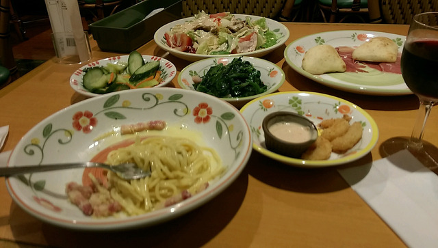 ワイン、プロシュートW、カルボナーラ、ピクルス、ポップコーンシュリンプきたわ