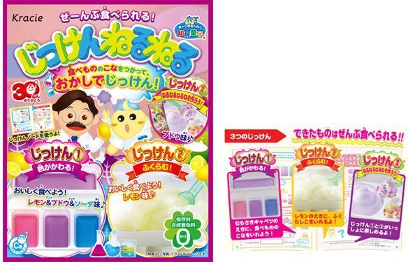 キットには「ねるねるねるね ブドウ味」と一緒に、2つの実験が楽しめる実験用の粉6種類と、クイズに答えたり結果を記録したりする「じっけんノート」を同梱。実験で色が変わる仕組みと膨らむ仕組みを学んだあと、「ねるねるねるね ブドウ味」を実際に作って実験をおさらいをしながら商品を味わえます。