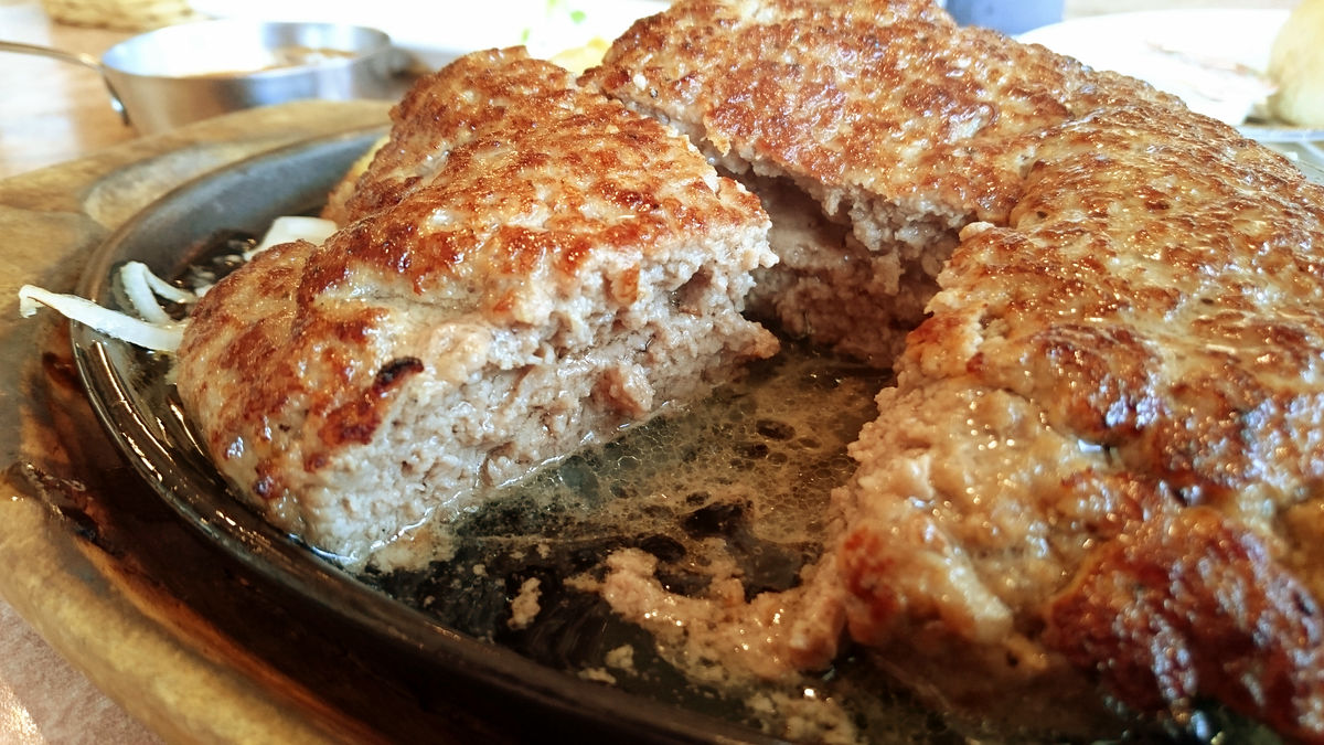 なんとか完食して、おかわりを注文。やって来たのは「どんハンバーグ」(200g)。通常は税抜799円の品ですが、無料です。