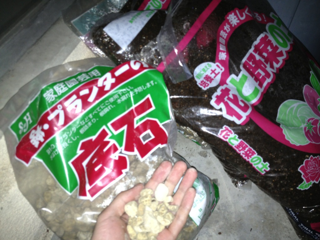 ちなみに土は激安スーパーみたいなトコで59円のやつを買った。プランターの中に水はけをよくするための石?をひいて、その上に土を入れてタネを巻く。