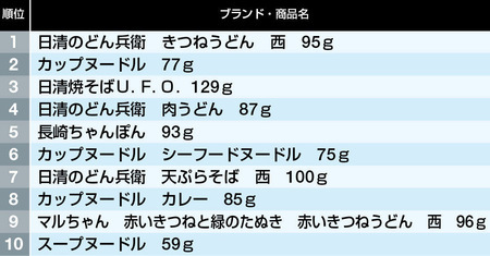 1位カップヌードル、2位赤いきつね、3位シーフードヌードル、4位緑のたぬき(東)