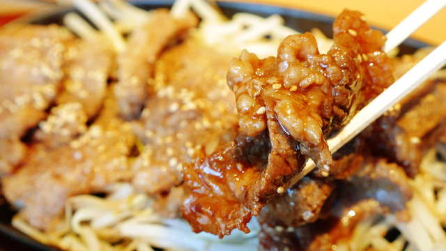 カルビ肉はかみ応えがある上に「特盛」なので、物足りないということはないはず。ただし鉄板と肉の間にはもやしがあり、鉄板の保温効果をあまり得られない様子。ゆっくり食べていると肉が冷めてしまうので、もやしと肉をひっくり返して鉄板の熱をもらえるようにするなど、工夫をしたほうが良さげ。