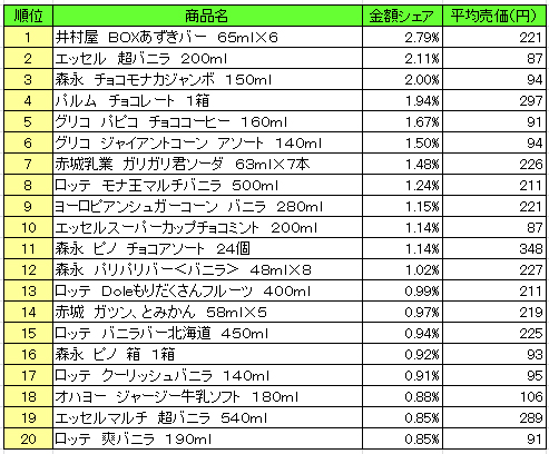 sssp://img.2ch.sc/ico/u_giko_ebi.gif 流通経済研究所が提供するPOSデータ分析サービス「NPI Report」によると、2016年7月4日~7月10日の「アイスクリーム類」のPOSデータによる売上ランキング(売上高上位20)は、以下の通りとなった。 「井村屋 BOXあずきバー 65ml×6」が1位だった。 アイスクリーム類の内訳は、プレミアムアイス、ファミリーアイス、パーソナルアイスその他、その他菓子類。 ■NPI Reportは、(公財)流通経済研究所が提供する、市場POSデータ分析サービス。全国約400店舗のGMS、SM、ミニSM業態のデータを集計した。 分類は、JICFS小分類を適用。 1位井村屋 BOXあずきバー 65ml×6 2位エッセル 超バニラ 3位森永 チョコモナカジャンボ 4位パルム チョコレート 1箱 5位グリコ パピコ チョココーヒー 6位グリコ ジャイアントコーン アソート 7位赤城乳業 ガリガリ君 ソーダ 8位ロッテ モナ王マルチバニラ 9位ヨーロピアンシュガーコーン バニラ 10位エッセルスーパーカップチョコミント 続きはソース http://makernews.biz/201607216673-4/