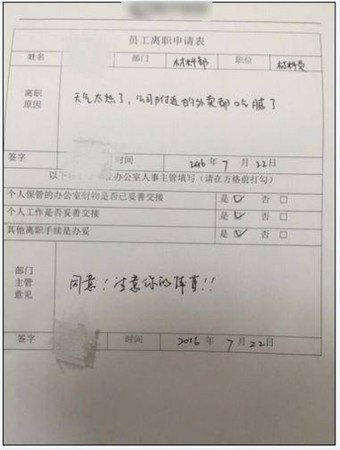 この辞表を書いた何さんは「最近、本当に暑すぎた。会社では1年ちょっと働き、ほぼ毎日デリバリーを食べていた。