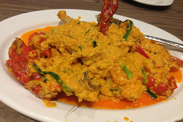 カニを油で揚げて甘辛いケチャップみたいなタレで食う料理
