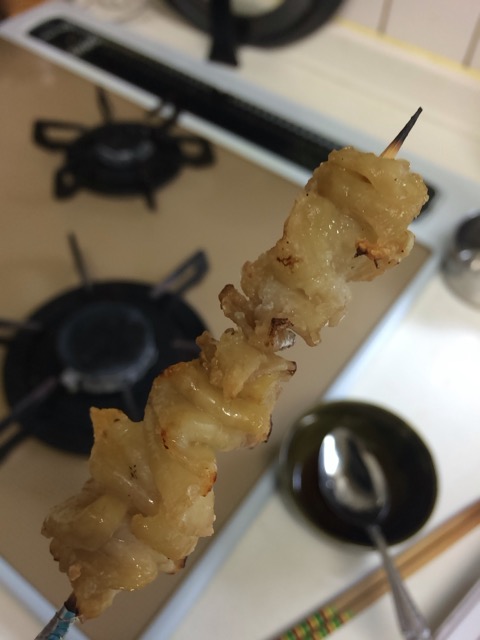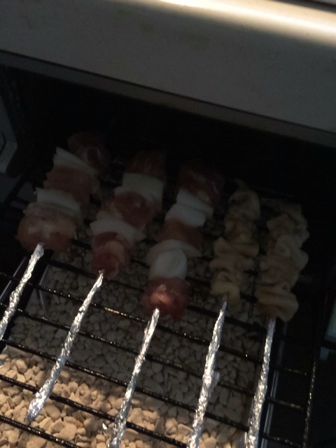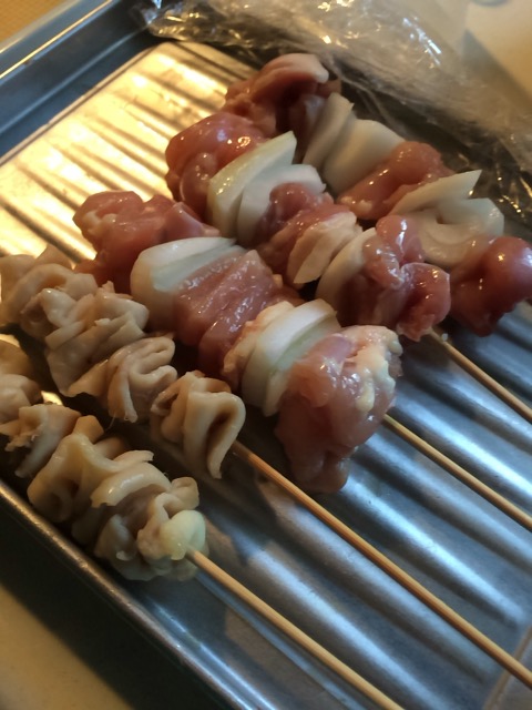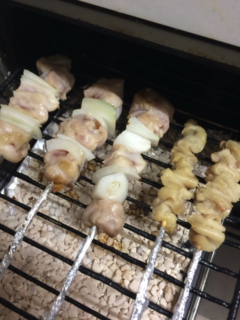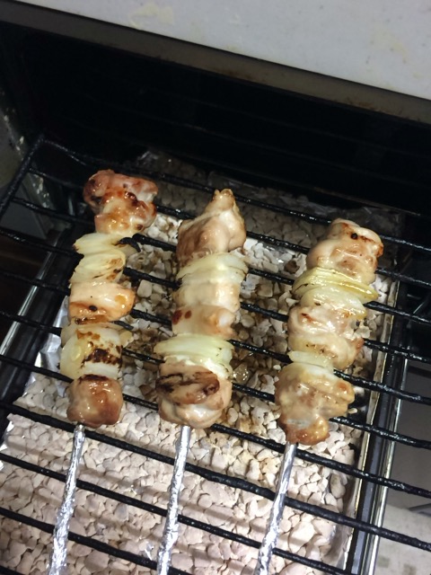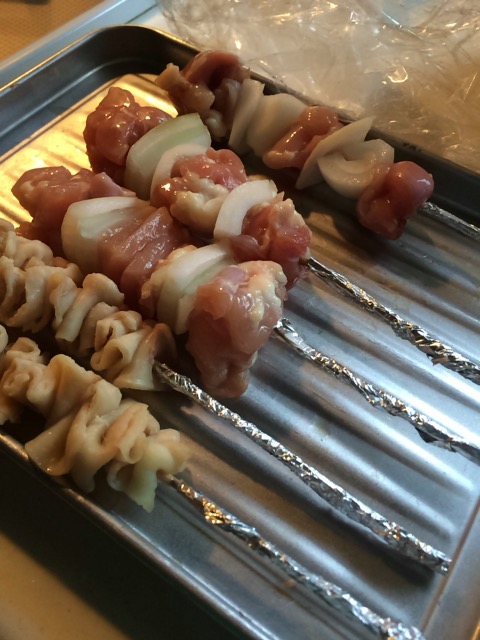 焼き鳥は魚焼きグリルでやくからアルミホイル巻いて常温にしてるところ