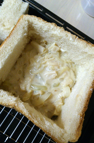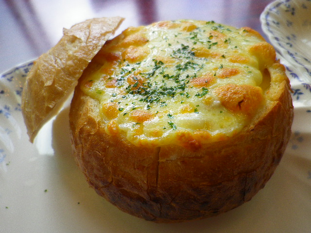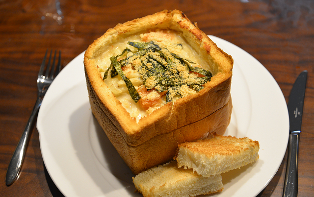 器に移して、別で焼いたくり抜いたパンを添えたら完成