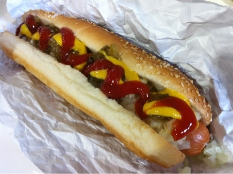 毎回買うのはホットドッグ。入れ放題のタマネギが至福。