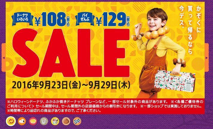 全国のミスタードーナツでは、2016年9月23日から29日まで恒例のドーナツセールが行われます。