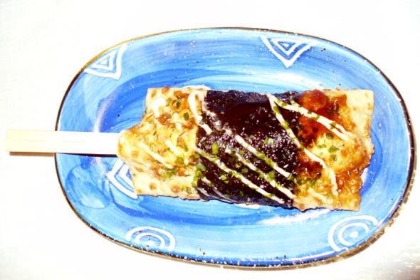 薄く焼いたお好み焼きを割り箸にくるくると巻いてソースや青のりをかける