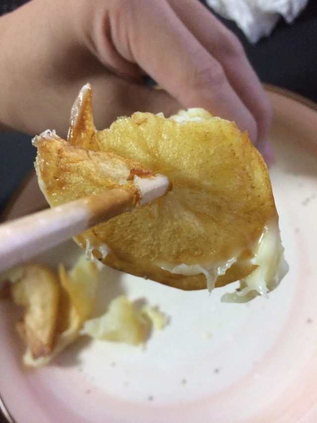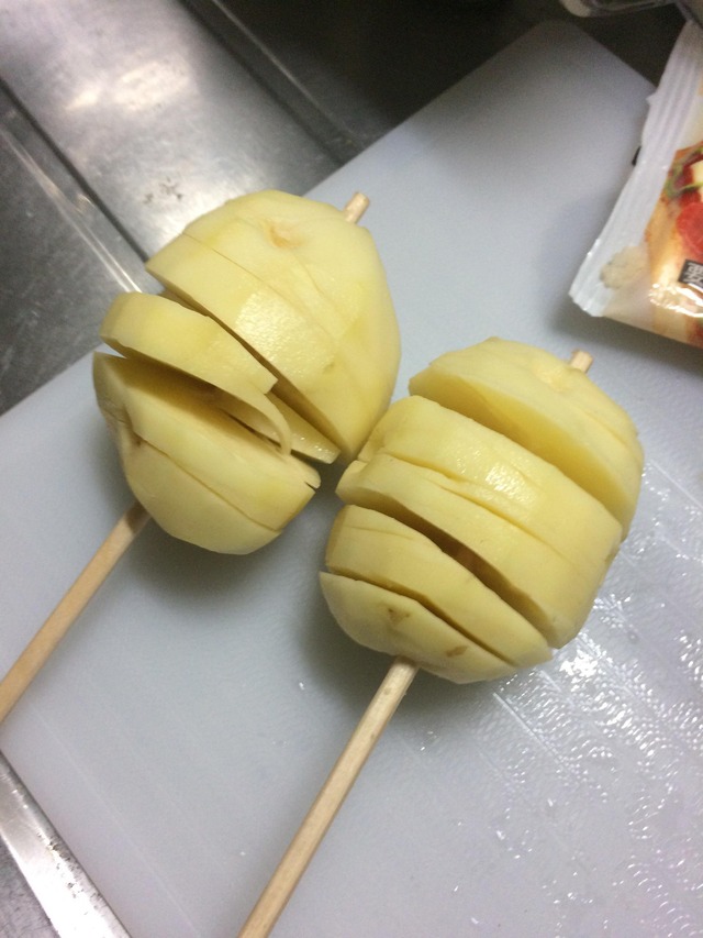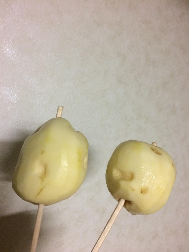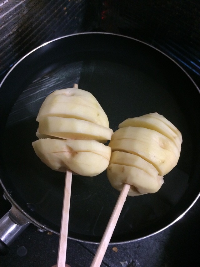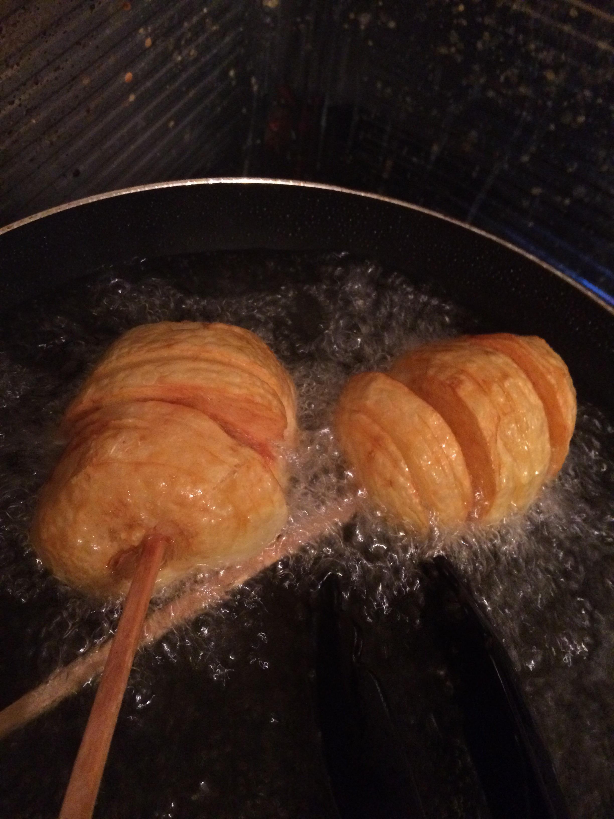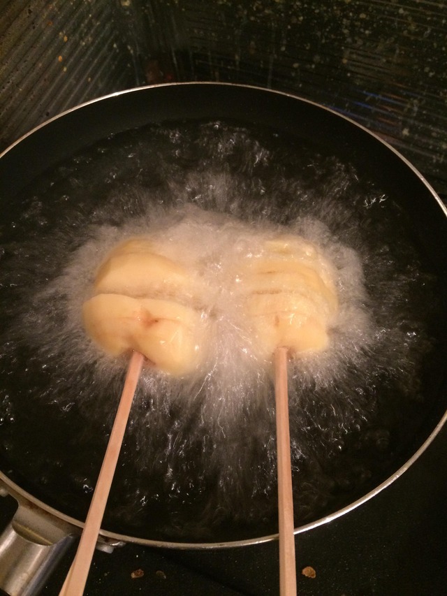 本来電子レンジか茹でで火を通した所で箸に刺して切り込み入れてく物だから揚げるのだけで火を通すと周りを焦がすか芯を残すのよね