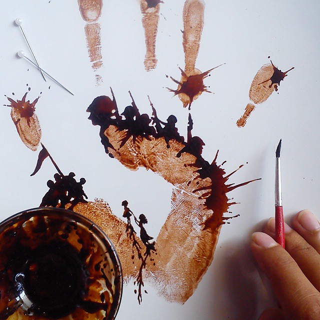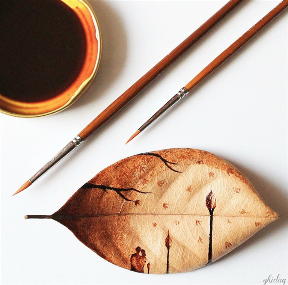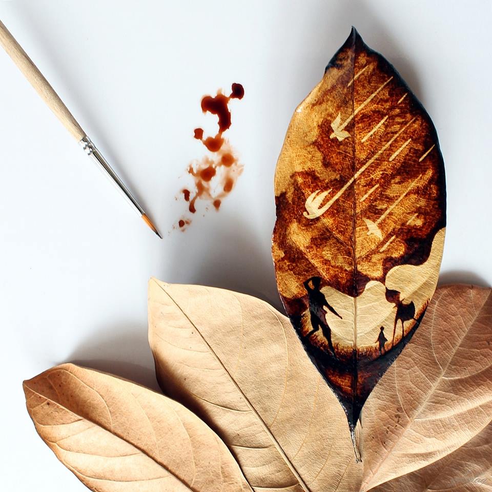 枯葉に珈琲で描いたもの いろんな枯葉を使ったら面白そう