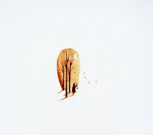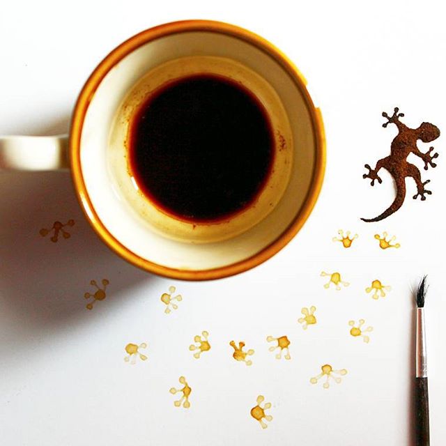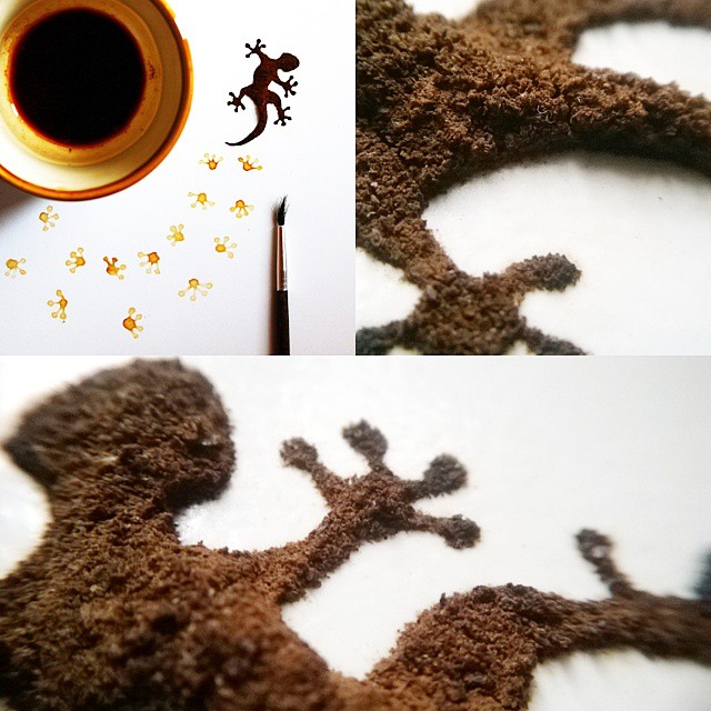 ヤモリの足跡がいいですね。本とかにコーヒーの水滴が飛んで跡がついたものから思い付いたのでしょうか。