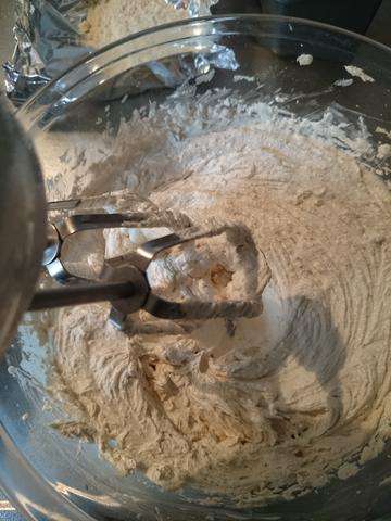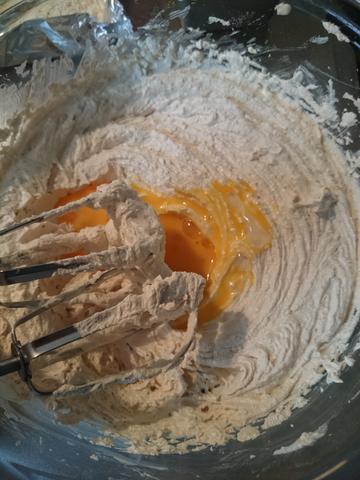 卵を少しずつ入れては混ぜます ここで分離すると美味しくなくなるので、 ・卵とバターの温度を合わせる ・卵は少しずつ加える ・卵を加えたらその都度しっかりと混ぜる これを守りながら混ぜます