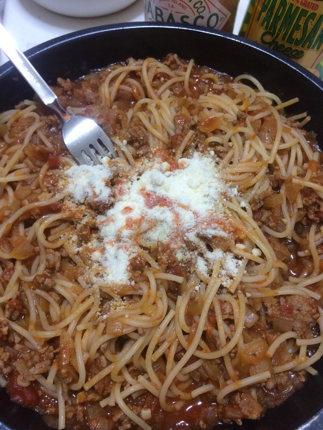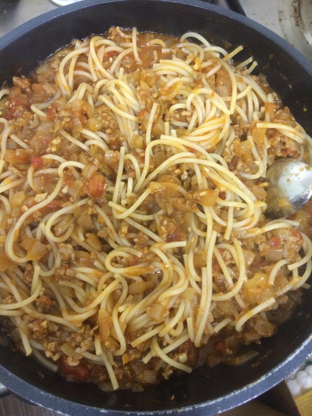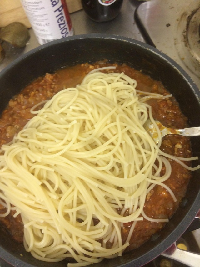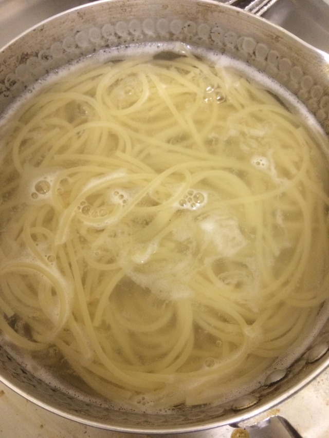 ボロネーゼの味を見ながら足りない者を足し、その間にパスタを茹でる。塩多めで海ぐらいの塩分濃度と聞いたことがあるけど目分量で。