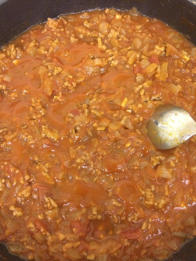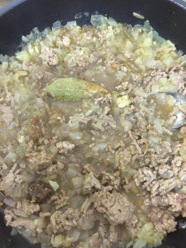 赤ワインを入れてローリエ、コンソメ、オレガノバジル多めに、シナモン少なめ、塩と胡椒を少し加えて水気が半分になるまで放置