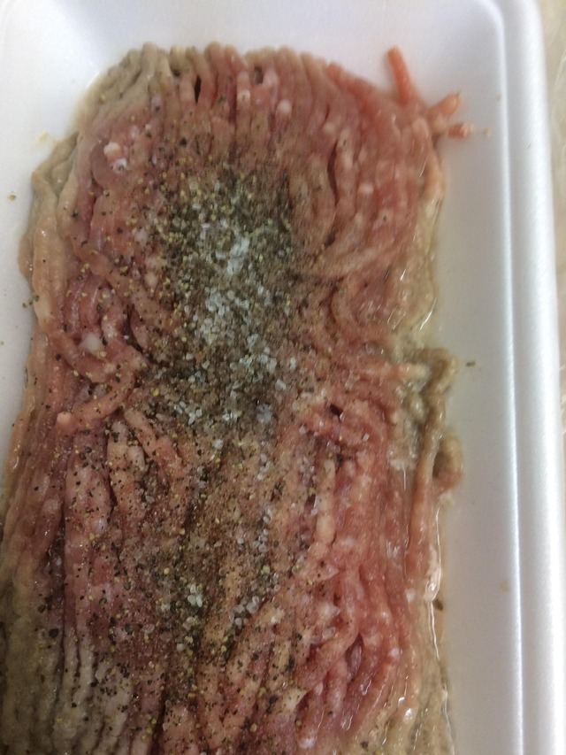 レンチンし過ぎて色悪いけど、ひき肉に塩胡椒をかけてハンバーグ状にする