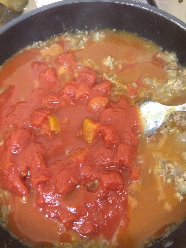 次に言い忘れてたけど中火から少し火をあげてトマト缶を入れる