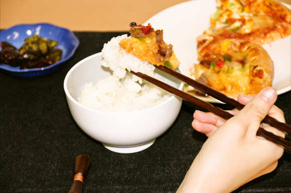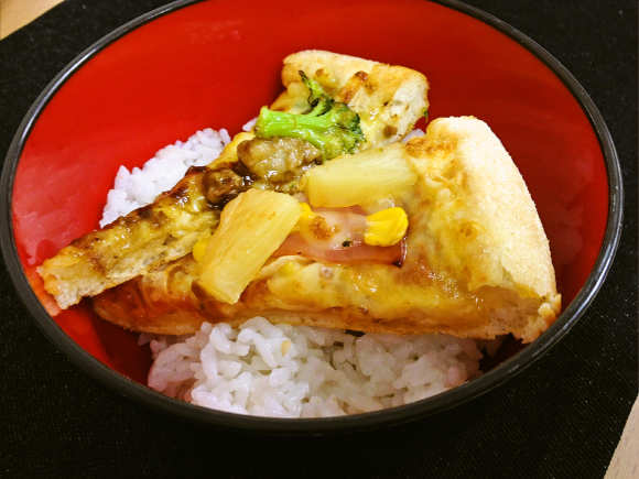 宅配ピザが数切れ余ったから翌日ご飯に乗っけて食べたけど悪くない