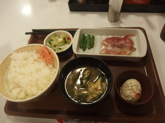 最近すき家がベーコンとアスパラつけた朝定食はじめたね