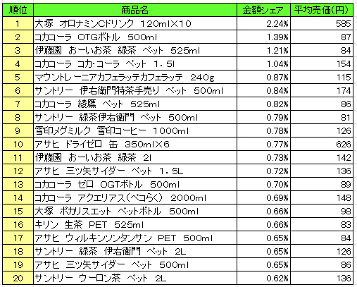 流通経済研究所が提供するPOSデータ分析サービス「NPI Report」によると、2016年11月14日~11月20日の「清涼飲料」のPOSデータによる売上ランキング(売上高上位20)は、以下の通りとなった。