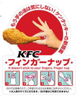 sssp://img.2ch.sc/ico/youkan.gif 油汚れ、もう気にならない=ケンタッキーが専用の指手袋 (時事通信)  日本ケンタッキー・フライド・チキン(東京)は14日、チキン商品をつかんで食べる際に手が油で汚れないよう、専用のポリエチレン製指手袋「フィンガーナップ」を導入すると発表した。15日から首都圏と関西の8都府県の222店舗で顧客への提供を始める。 続きはソースできない」といった声が数多く寄せられていた。  http://headlines.yahoo.co.jp/hl?a=20161214-00000097-jij-bus_all 「オリジナルチキン」をさらにおいしく、楽しく食べられるグッズが登場! KFCのチキン用指手袋「フィンガーナップ」12月15日からKFC222店舗で導入! http://japan.kfc.co.jp/news_release/news161214kfc.html