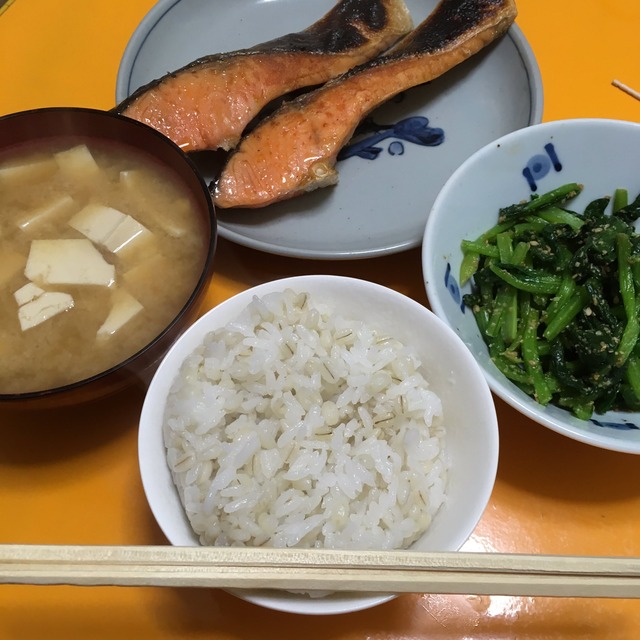 鮭は1切れでいい、ほうれん草の他に何かしら漬物があれば充分だな。