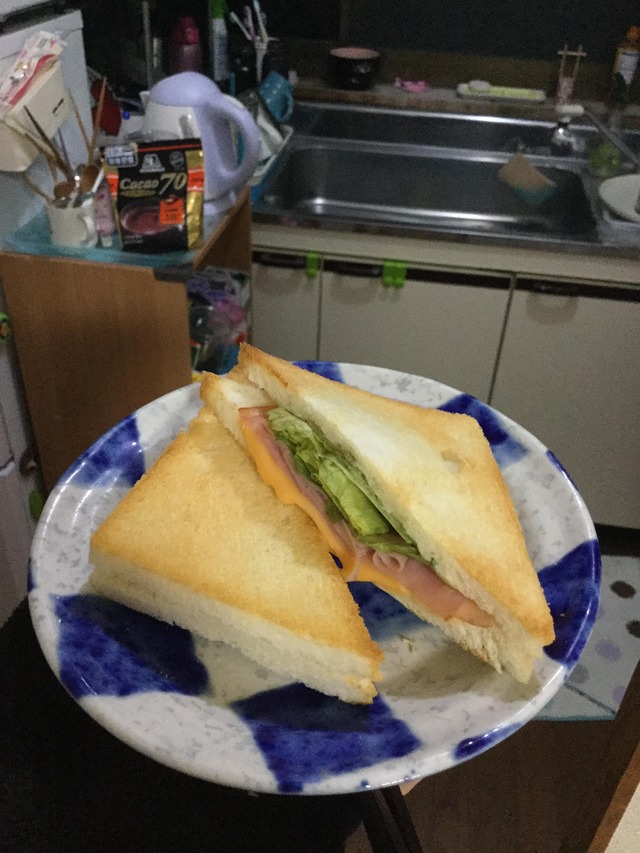 食パン焼いてマーガリン塗ってハムととt-ズとレタス挟んで切るだけ