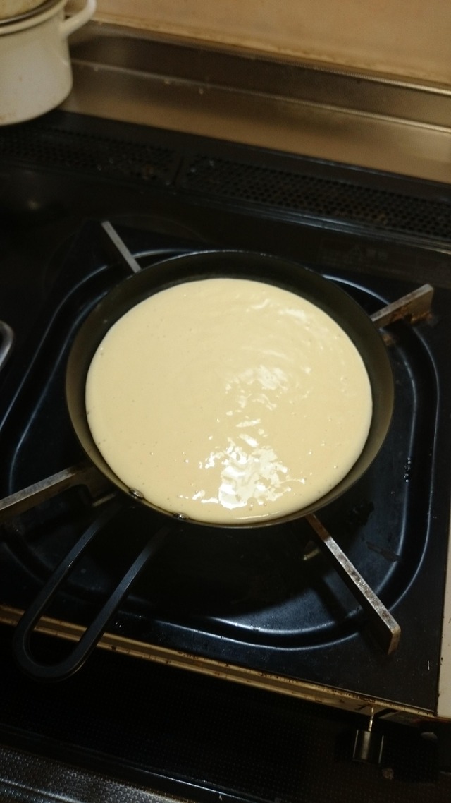生地を注ぐ前に一旦ぬれぶきんでフライパンを覚ますと焦げないで