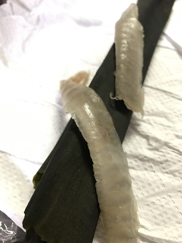エンガワ、寄生虫いるから気をつけて食えよ。 切ったら切り口から赤くて細いのがニュルニュル~とか普通にあるからな。 まぁ、昆布で〆てるから時間経ってもう中で死んでんだろうから出ては来ないだろうけどさ。