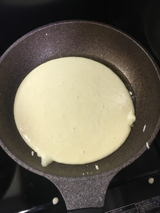 少な目に生地を投入、テフロンならとにかく弱火で片面が泡立つまで焼く5~7分(7割火を入れる)反して3~5分焼いて出来上がり