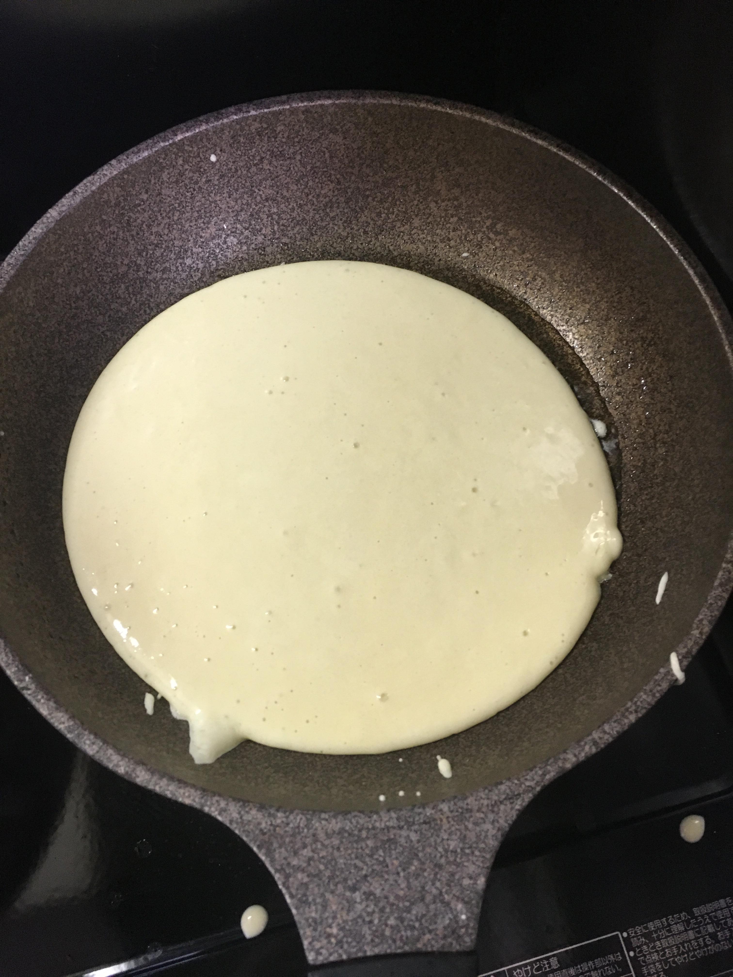 フライパンは油引いて熱した後、塗らしたふきんで一旦冷ます。後は普通に焼くだけ。(*´ω`*)