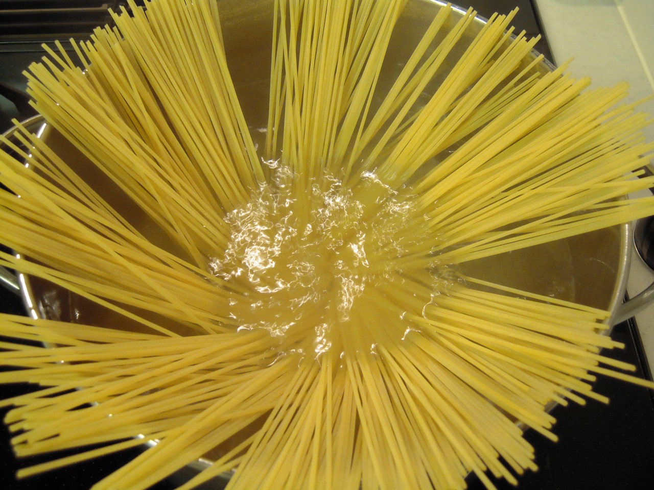 生パスタに比べて乾燥パスタは製法上、表面がツルツルでソースが絡みにくいのでお湯を少なめに茹でるか、捨てなくて済むくらいのギリギリの水量でゆでるといい。