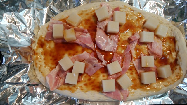 あらかじめ作っておいた照り焼きソースとあらかじめ切っておいた餅とベーコンをのせます