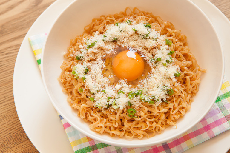 もしくは3分経ったらスープは別容器に入れて、麺には胡麻油とネギ、醤油少々で油そば風にして食う、卵あればお好みで卵黄を混ぜる。