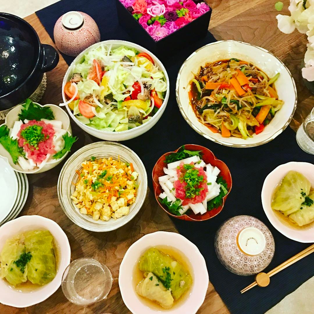 作ったもの全部!あとお花も写真に入れよう!って欲張ってこうなったんだろうけど、普通に配膳した方が美味しそうに見えたと思う…