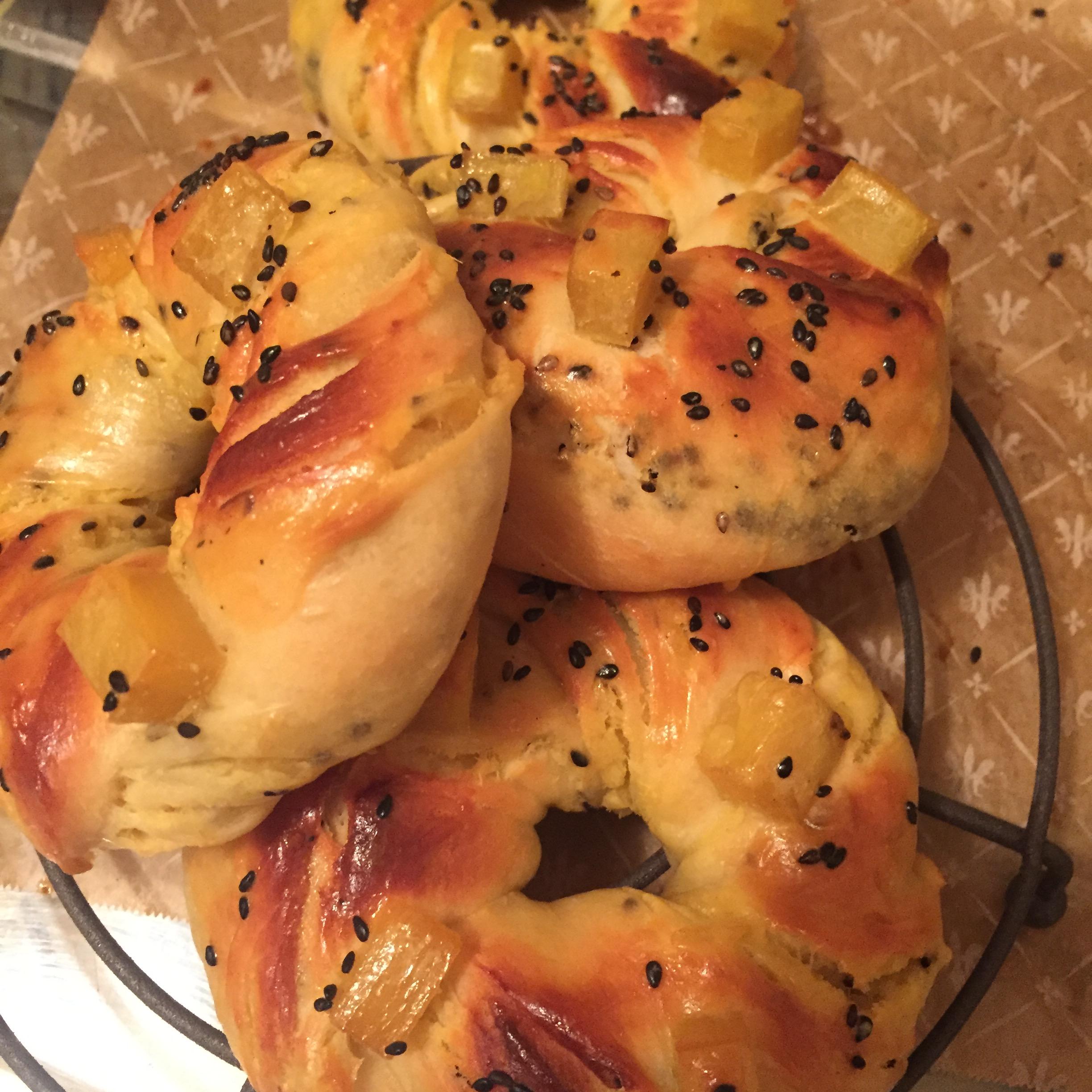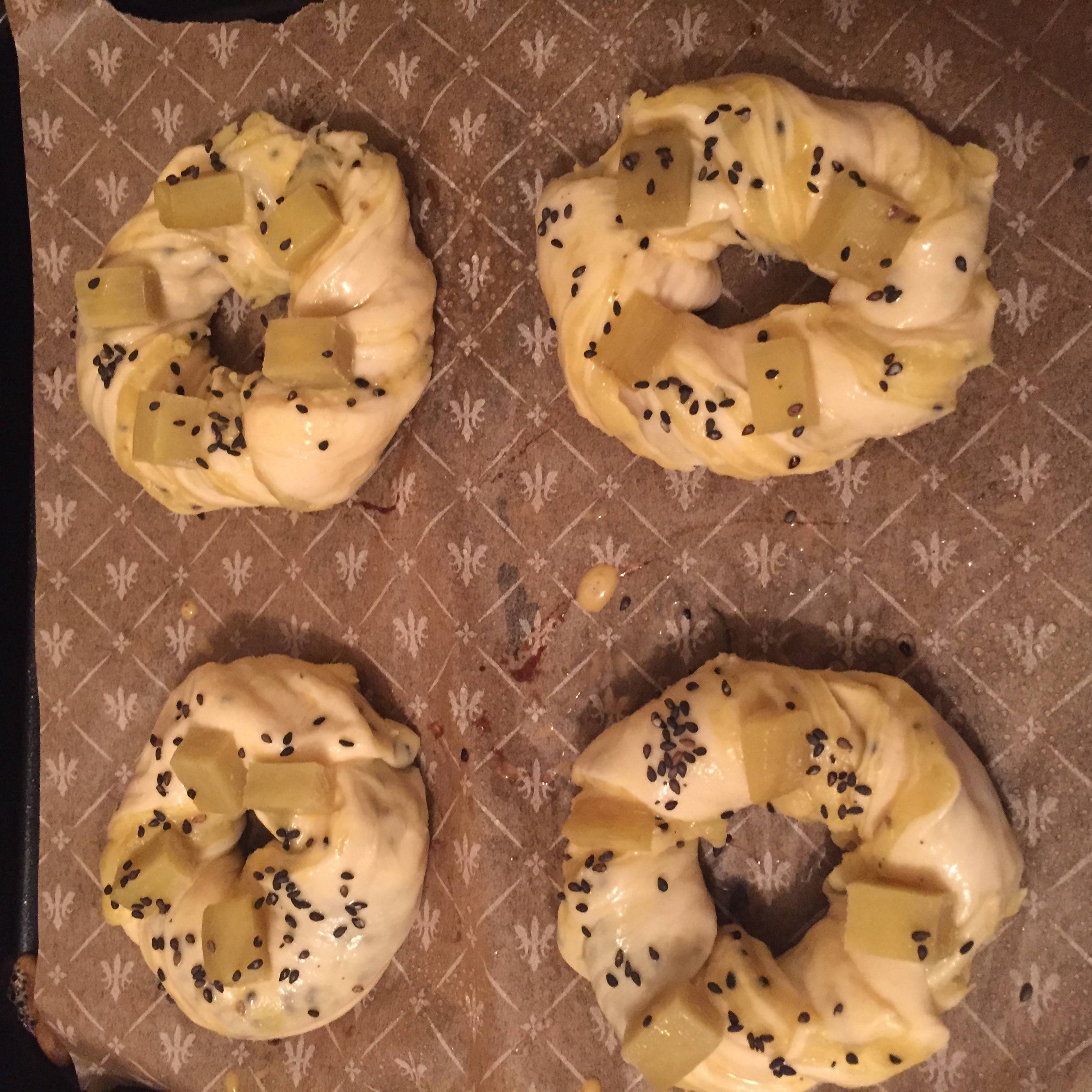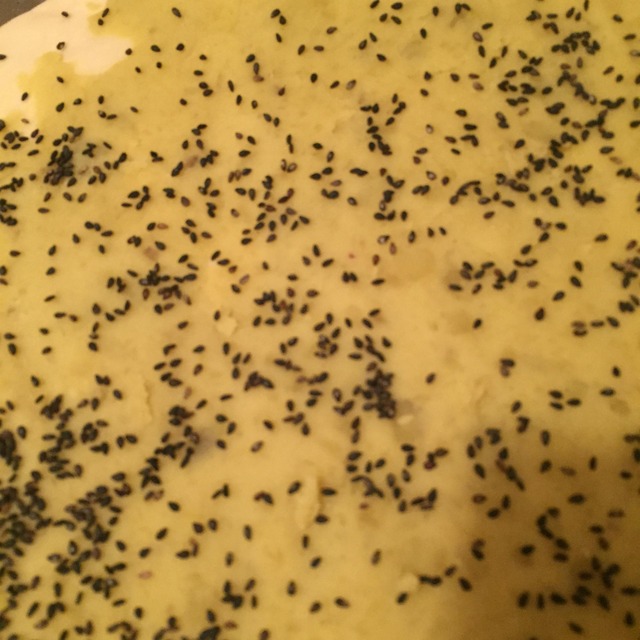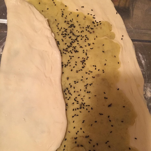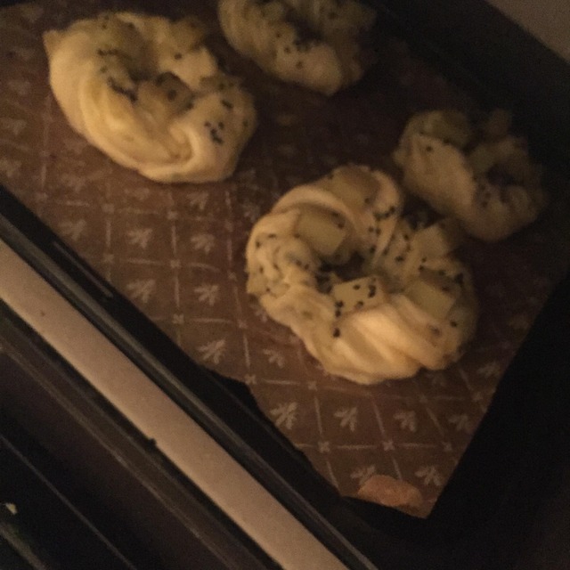 発酵が終わった生地に卵を塗り、黒ごまを振り、あればさつまいもを小さくカットしたものを乗せます(´・ω・`)