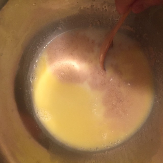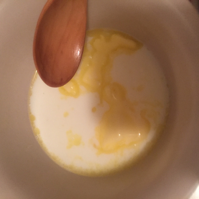 牛乳とバターを耐熱容器に入れて500Wで30~50秒チン(´・ω・`)バターが溶けるまで混ぜるよ!