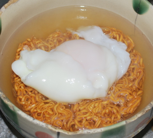 先に陶器のうつわとフタにお湯をかけて温めておく。その湯は捨ててチキンラーメン入れる。卵は常温に戻しておいたもの。それをのせる。お湯かける。蒸気も利用して卵に火を通すためふたをする。そして3分待つ。これでできた試しがない。