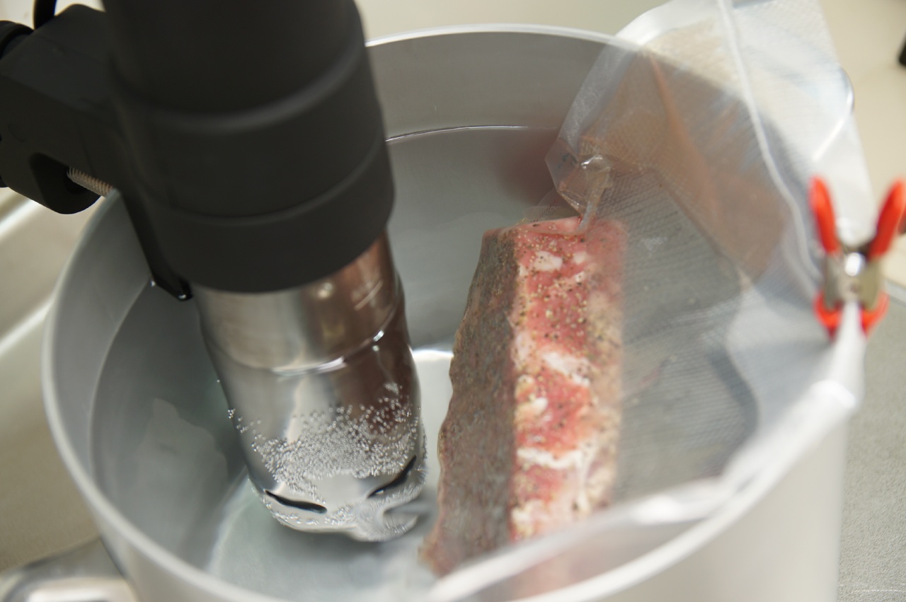真空パックした肉をお湯につけねつを通す