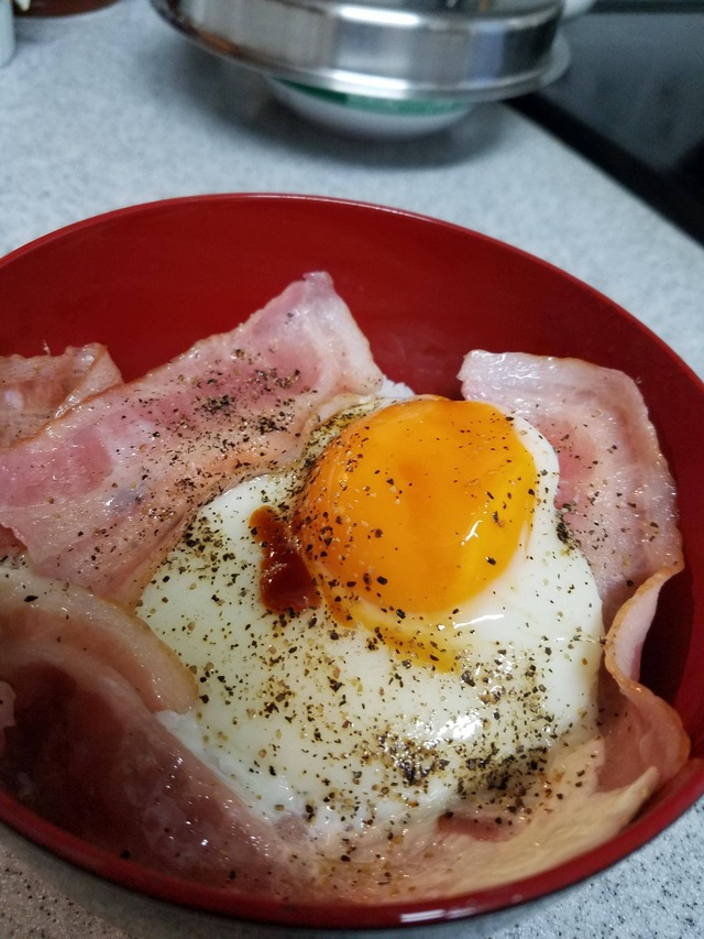 ご飯の存在を感じられないのだが本当にベーコンエッグを丼に盛っただけ?