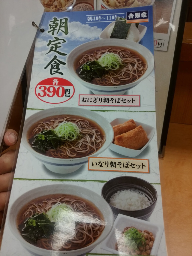 青い吉野家のモーニングセットが有能(´・ω・`) おにぎり朝そばセットくだちゃい(´・ω・`)