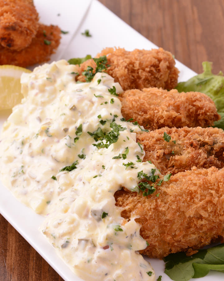 カキフライ、タルタルソースたっぷりで。あと白ワイン下さい。