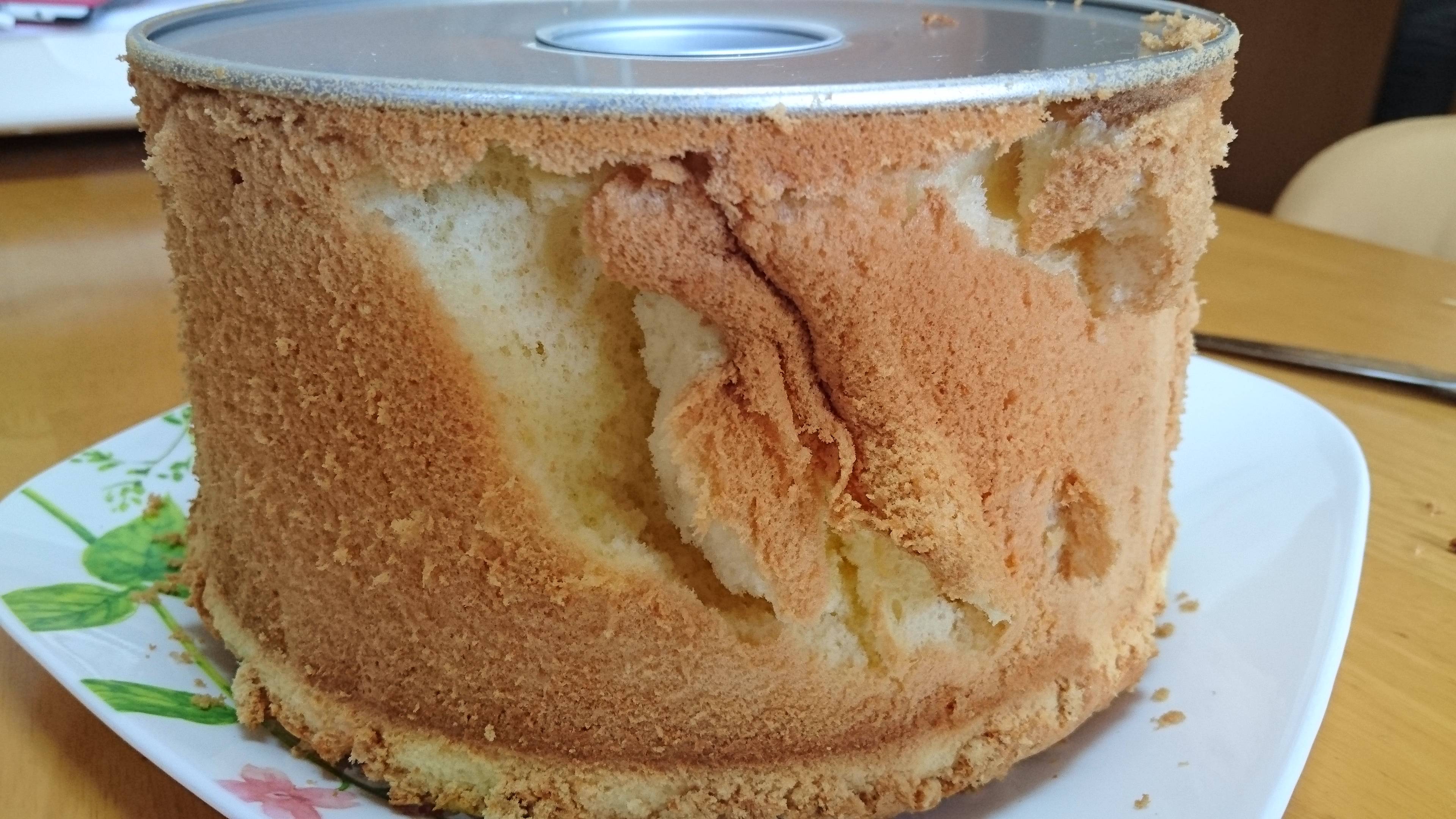 ぱっと見で思うことは、※一の指摘通り生地を型に入れた際に生地と型の間にある空気を抜くために適度な回数叩いていないのでは?ということと、ペティナイフを斜めに入れているから側面が崩れたようになっているのでは?ということ。上辺が凹んでいるから乳化がうまくいかなかった、あるいは空気を抜く際に底部を叩き過ぎたことも考えられるね。
