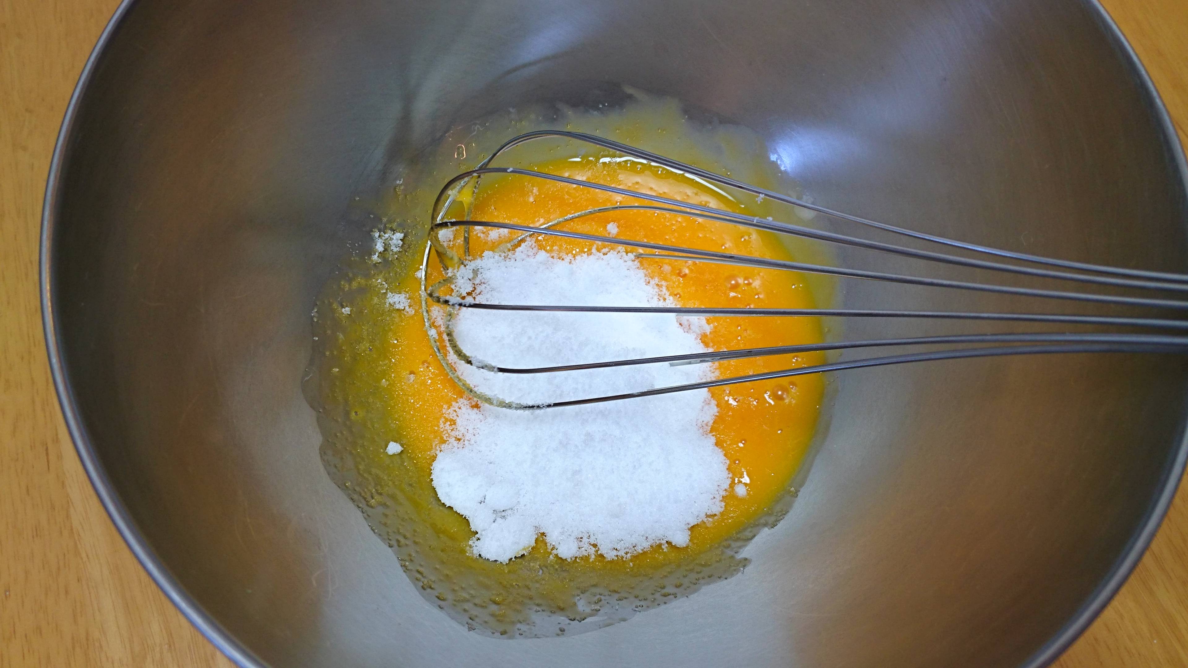 卵黄に砂糖を分量のさん3分の1くらい入れてまぜる
