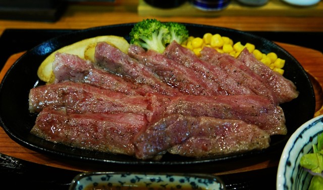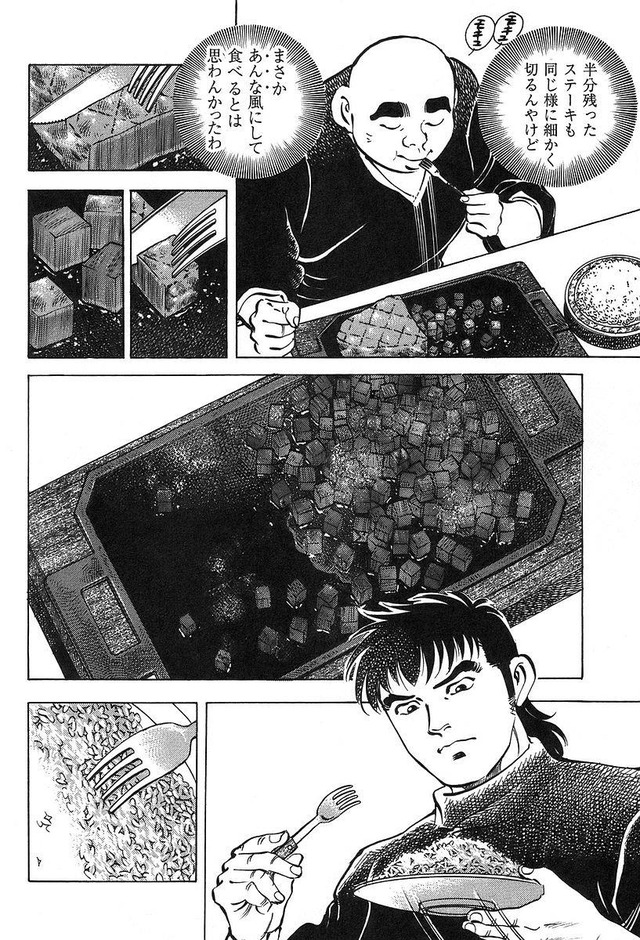 主人公は肉を沢山食べるために普通、賽の目、薄切りに切り分けて味付けも付属のソース以外にバター醤油、わさび醤油、ポン酢大根おろしと使い分けてる。